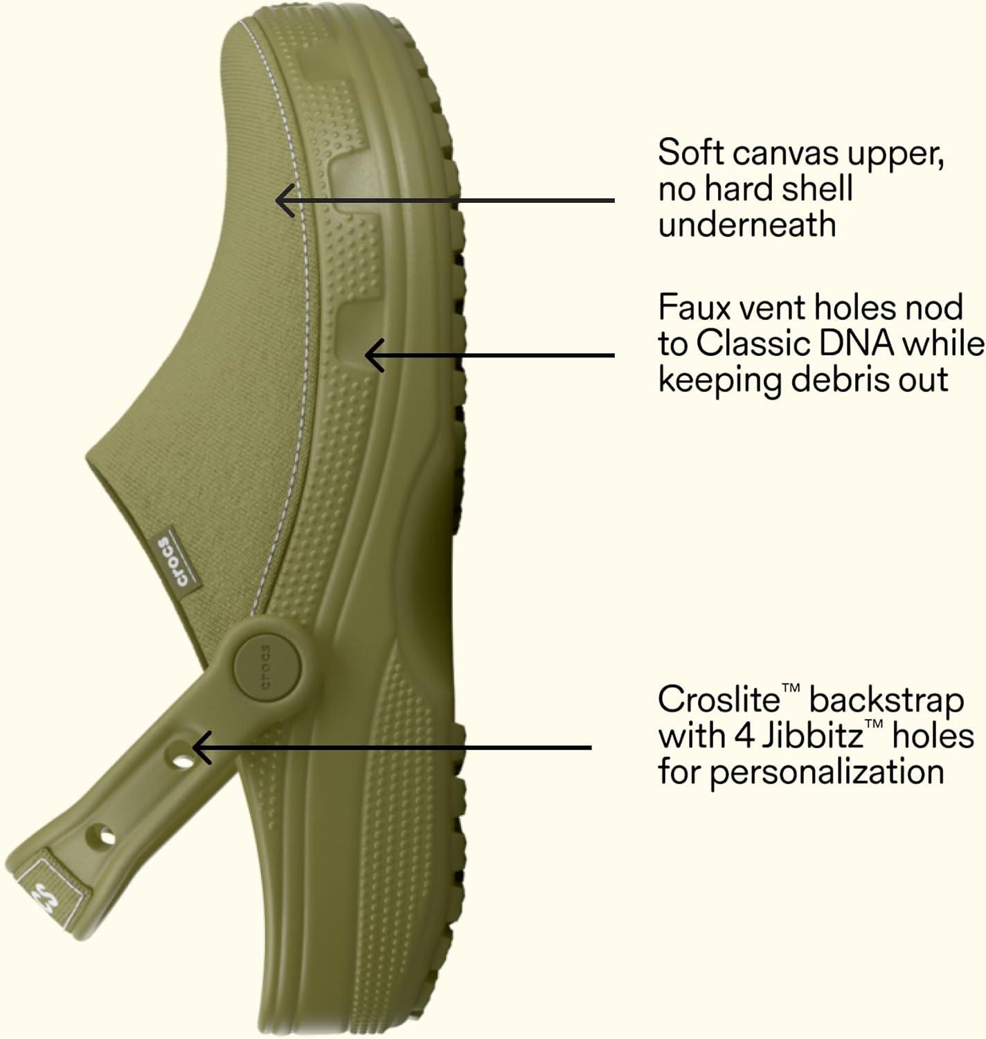 The Crocs Classic Crafted Canvas Clogs redefine versatile style with their sophisticated canvas upper, perfect for dressing up or down. Whether paired with chinos for a polished look or denim for casual comfort, these waterproof clogs bring effortless style to any outfit. These come with a Croslite outsole for durability and support, a pivoting heel strap for a more secure fit, and iconic Crocs Comfort insole for lightweight and flexible 360-degree comfort. Ideal for those who value both function and fashion, the Classic Crafted Clog is a must-have for any wardrobe. Plus, the Jibbitz holes on the heel straps make it easy to personalize your look even more. Unlined. Low-top design. Round toe shape.