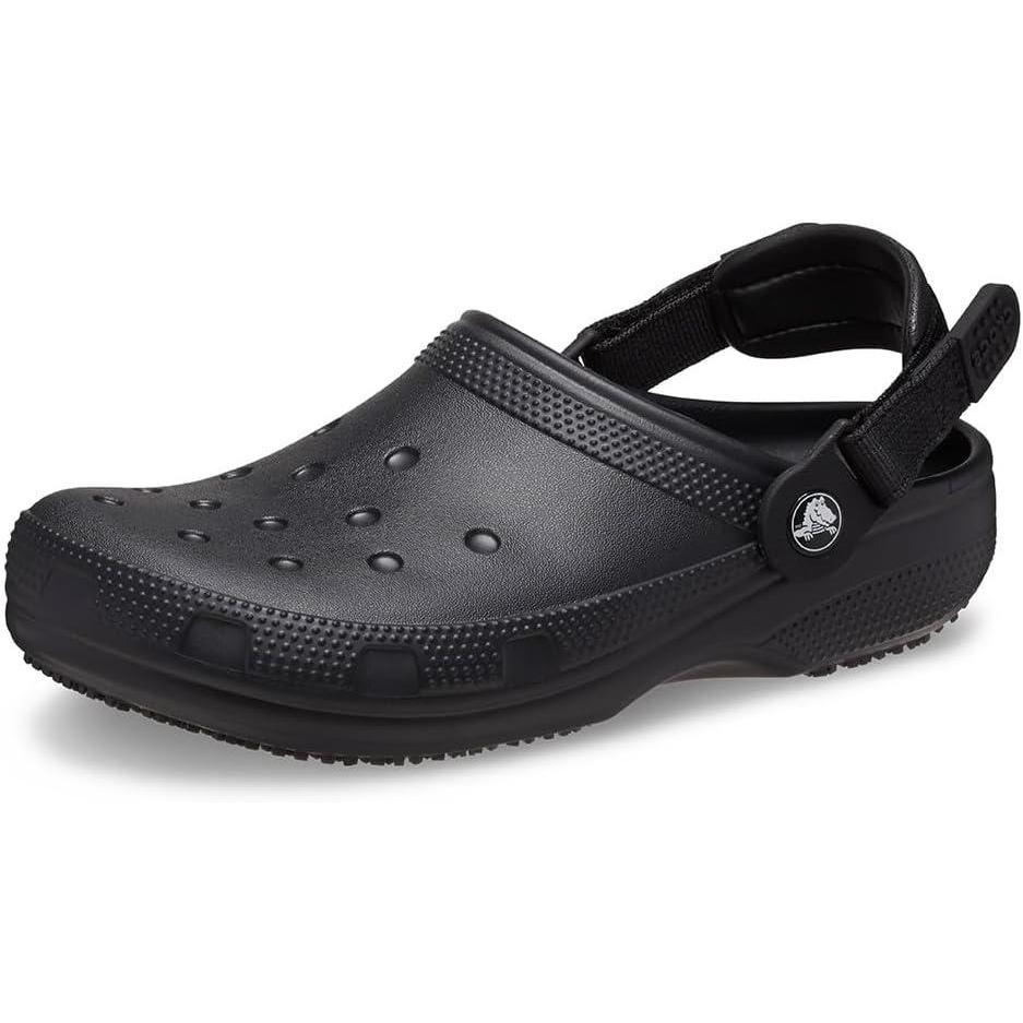 Enjoy the comfort and style of the iconic clog, now with a slip-resistant outsole and unique adjustable heel strap. In this versatile clog, you'll have the benefit of enhanced traction and security, which can meet a variety of needs. The specially-designed heel strap adjusts to be extra secure, and is easier to get on and off with its textured pull tabs. Features the same Crocs Lock slip-resistant treads as found in the Crocs At Work collection. Plus, Jibbitz holes on the upper makes them easy to personalize. The Classic SR Clog offers the opportunity to be confident, secure and comfortable in your own shoes. Find Your Size: We recommend sizing down (e.g. if you are a 7.5, size down to a 7). Meets EN ISO 20347:2012, OB, SRC. Meets ASTM F2913-11, CE certified. Waterproof ethylene vinyl acetate upper. Unlined. Ethylene vinyl acetate insole. Enclosed, round toe silhouette. Iconic Crocs Comfort. Pivotable, adjustable backstrap. Crocs Lock slip-resistant tread. Rubber outsole.